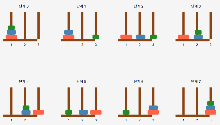 설명: 세 개의 장대가 있고 첫 번째 장대에는 반경이 서로 다른 n개의 원판이 쌓여 있다. 각 원판은 반경이 큰 순서대로 쌓여있다. 이제 수도승들이 다음 규칙에 따라 첫 번째 장대에서 세 번째 장대로 옮기려 한다.